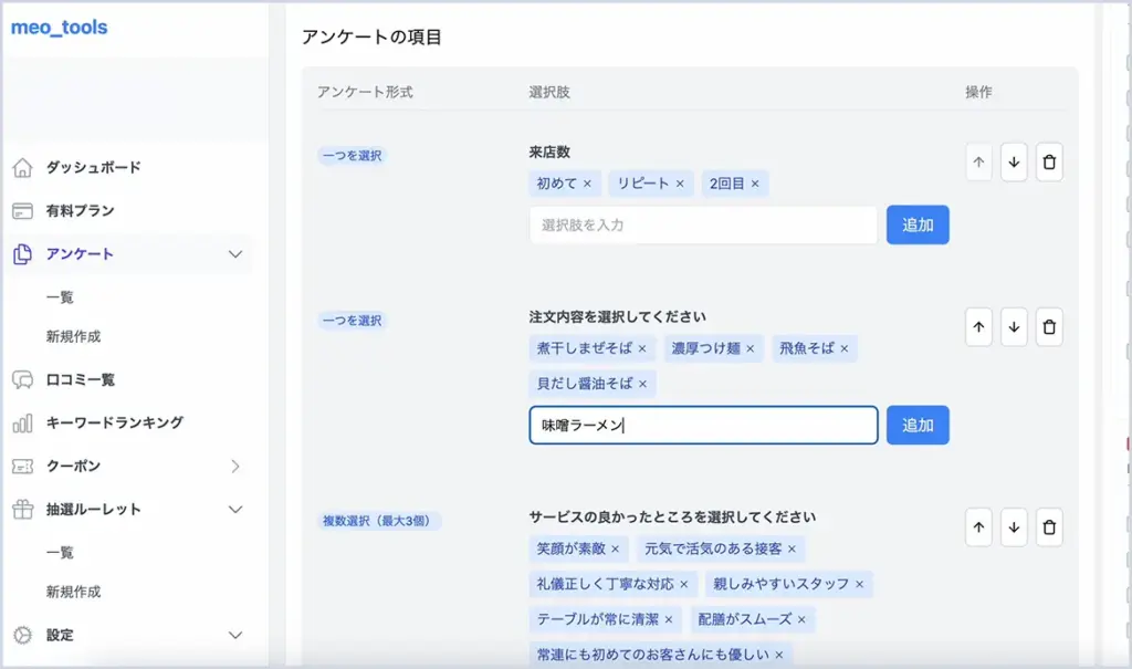 口コミに書いてほしい内容を含めたアンケートと、抽選クーポンなどを設計します。