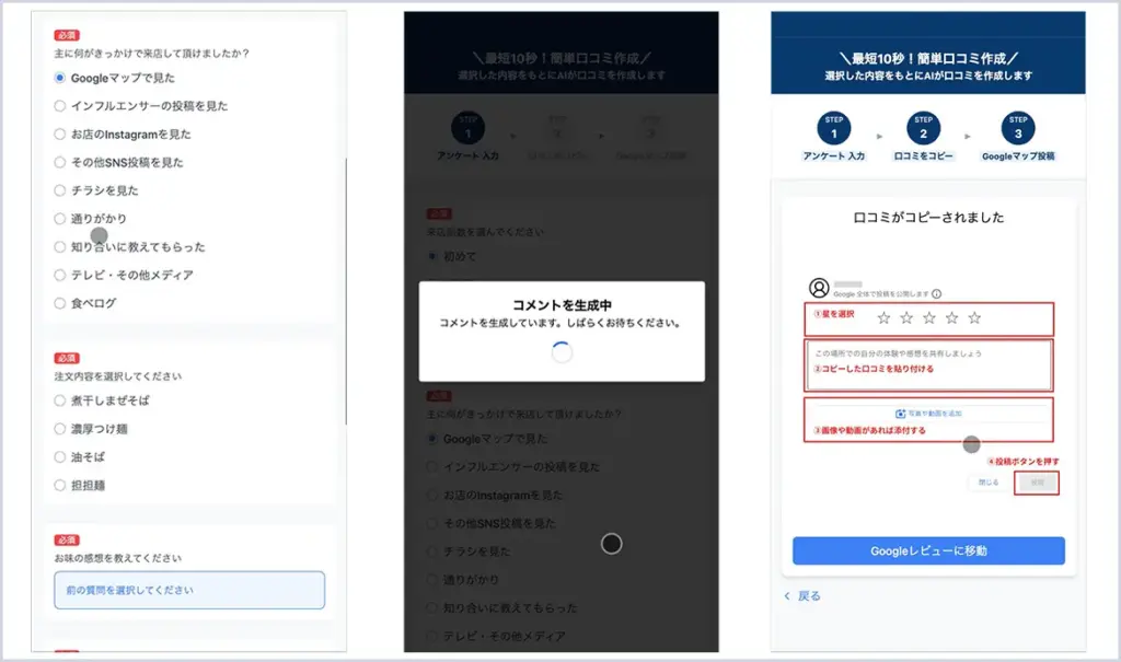 お客様は“選ぶだけ”、AIが文章にするから、負担ゼロで自然な口コミ投稿が実現します。