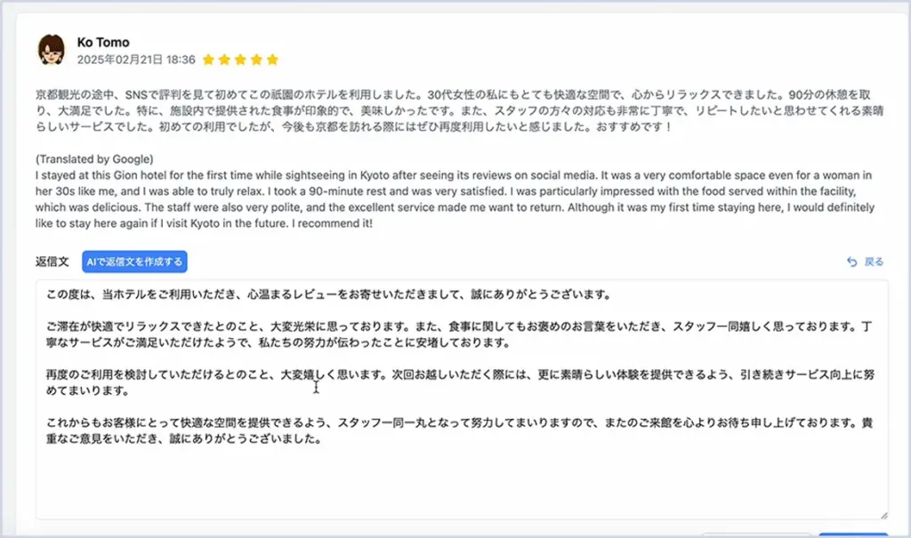 溜まりがちな口コミ返信も、AIが店舗のトーンに合わせて自動作成&返信してくれるので、運用の手間を激減。