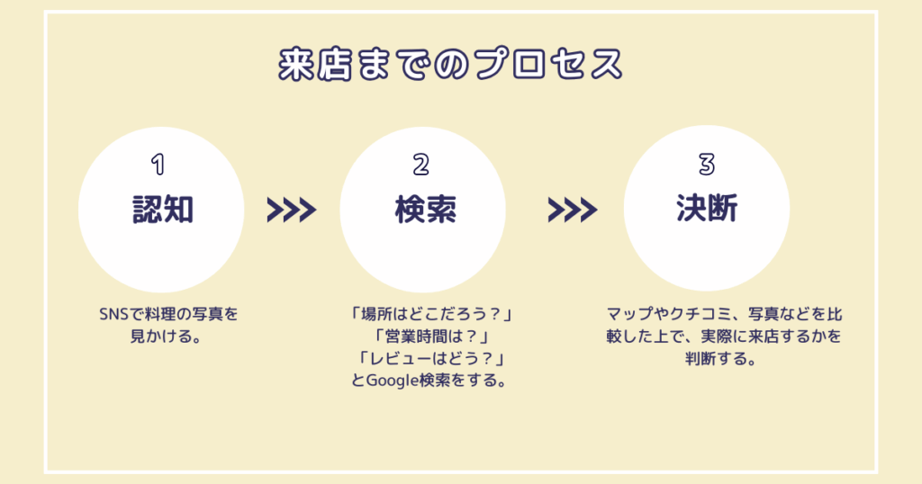 - 「場所はどこだろう?」「営業時間は?」「レビューはどう?」とGoogle検索をする
